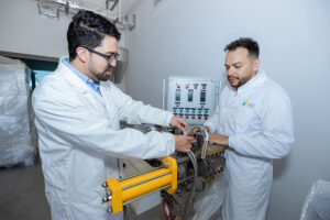 Polymeron-medeoprichters Martin Ibarra (links) en Rodrigo Jimenez sleutelen aan hun nieuwe extruder. (Foto: KAUST)
