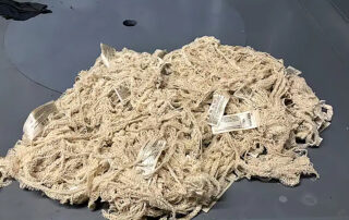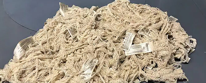 Recycling van polykatoen textielafval Resten na verwerking van shirts van zuiver katoen. Alleen de polyester labels en naden blijven achter (Afbeelding: HIMS/Avantium) [...]